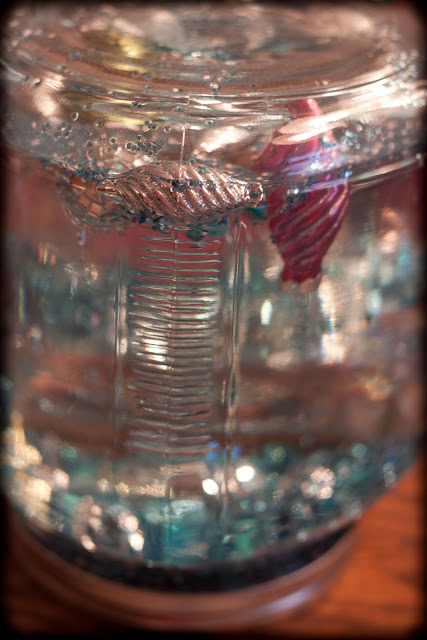 I put some glitter in the bottom of some glass jars along with some pretty sparkling ornaments that I glued to the tops (since it is eventually turned upside down). Some ornaments I left free so that they would float to the top.